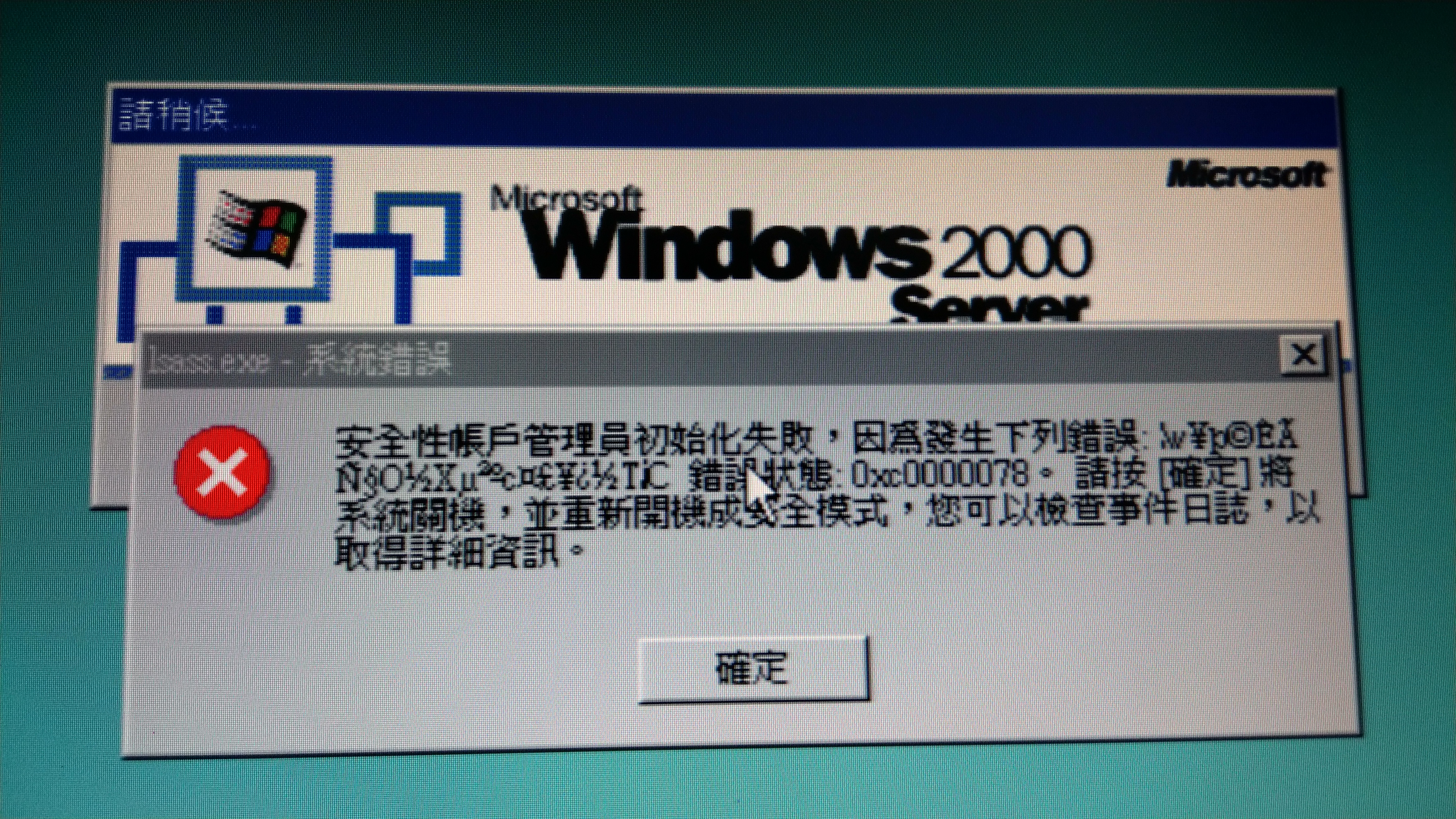 將上述5個檔案步驟完成後,如重開機出現下圖情況,且利用Windows Server 2003 R2 原廠光碟進入修復模式後,要求輸入密碼時,皆顯示密碼錯誤,3次錯誤後,自動重開機。